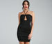 Channel romance in a halter dress that brings the charm. The dress features a halter neckline. a sexy keyhole cutout at the center of the bodice. ruching throughout to enhance curves. and a short-length hem. The dress is composed of a smooth knit fabric that offers a form-hugging fit with a moderate stretch. Complete look with heels and earrings for a night on the town.