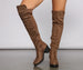 Slay in chic boots that command attention! The boots feature an over the knee fit. a 50/50 nylon and faux suede composition. an almond toe. lug sole. and a low block heel. Complete look with a cardigan and skinny jeans.