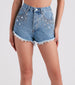 Bring the 90s back in glamorous fashion! These denim shorts feature a flattering high-rise waist. front rhinestone beading along the pockets. and a form-hugging silhouette with a cut-off frayed hem. The shorts are composed of vintage-inspired medium-wash denim fabric with minimal stretch. Style with a cute bodysuit and sandals to complete the look!