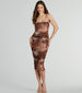 Let your look do the talking in this mesh midi dress! With an eye-catching abstract print and adjustable spaghetti straps. this midi dress will show off your style while the bodycon fit and side-ruched seams enhance your curves. Complete the look in trendy mules for an art show downtown!