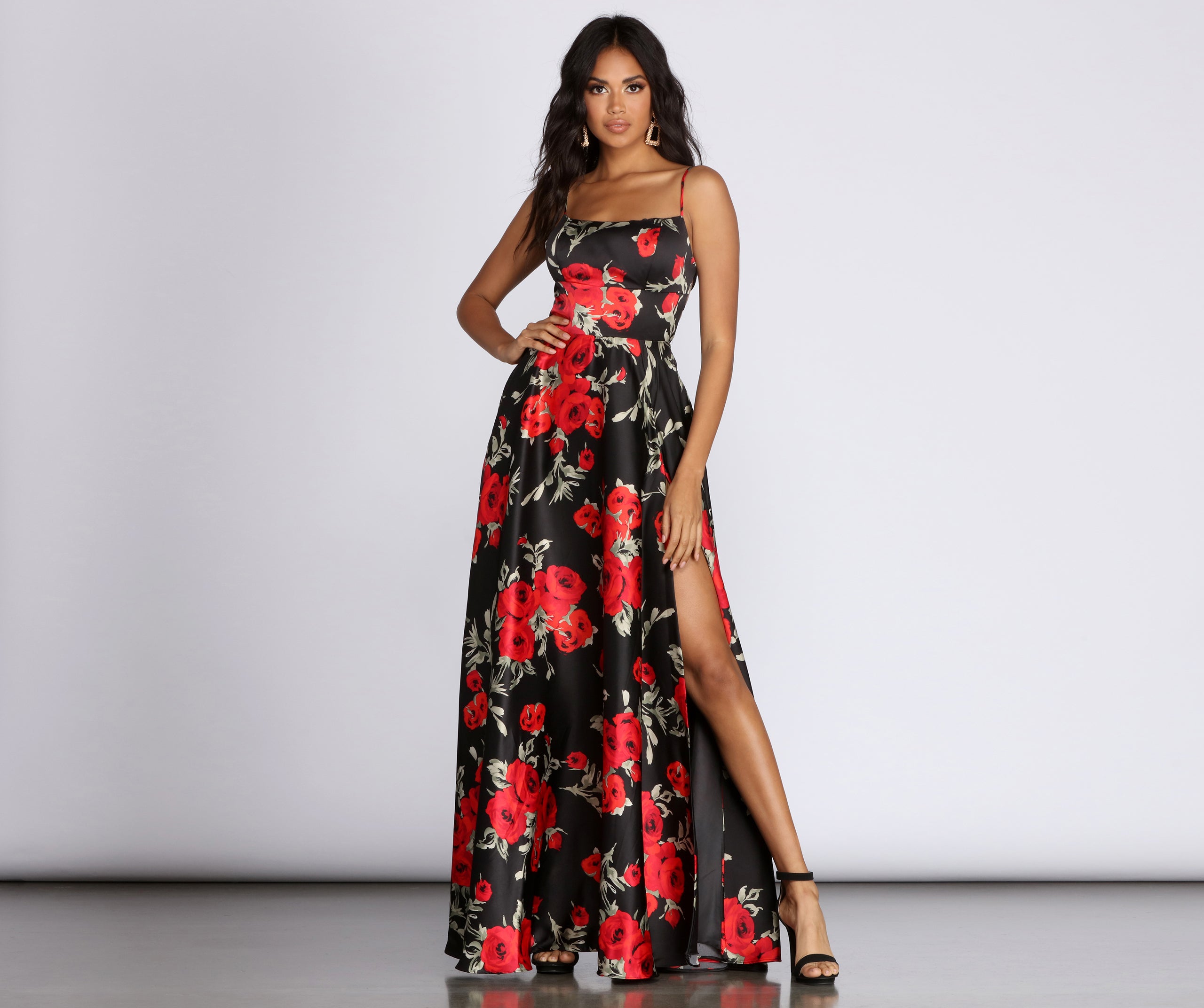 Lace up in our romantically-inspired Adelia dress! She features a sleeveless bodice. a scoop neckline. padded cups. adjustable spaghetti straps and an empire waist. Her back features a bold open design accented with lace up straps. Her waist leads to a sweeping A-line skirt with a high side slit to bring the drama! She is composed of lined satin-like fabric that offers a relaxed fit with minimal stretch.