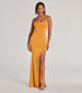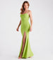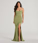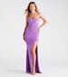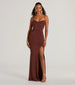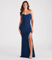 Steal the show in the chic Adera formal dress as you raise a toast to the newlyweds. graduates. or award recipients at a banquet! She stuns in a sleeveless sweetheart neckline with a chic cowl draping. a padded bust. spaghetti straps. and a curve-hugging mermaid silhouette with a sultry high front slit and long hem. The formal dress is composed of a slinky knit-lined fabric with a moderate stretch. Complete the look with an embellished box clutch and heels.