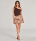 This adorable floral mesh mini skirt features a trendy drop-waist silhouette paired with a mini-length A-line hem with a lettuce-edge trim for a flirty flair. Style with a bodysuit and mules.