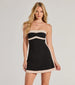 You'll be an adorable stunner in this mini dress designed with crepe fabric with a contrast color block outline for a chic look. It features a strapless straight-across neckline. a high waist seam. and a short A-line silhouette to add that flirty flair.