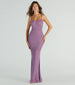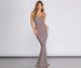 Life isn't perfect. but your dress can be! Our Ainsley gown is more than perfect with her slim form fit. and her glittering reflections. She features a V-neckline. built-in padded cups. spaghetti straps that lead to a square back. and a form-hugging silhouette that flares out to an elegant floor-sweeping finish. The formal dress is composed of a gleaming glitter knit material that offers a moderate stretch. Complete the look with rhinestone earrings.