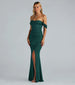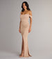 The Airlie formal glitter dress is an exquisite dress for prom to make your shimmering entrance! She features an off-the-shoulder sweetheart neckline that gracefully complements the padded bust and short-sleeve cuffs. while the mermaid silhouette creates an elegant shape. and offers a sexy high front wrap slit along her floor-length hem. The formal dress for prom is crafted from a glitter knit fabric with the perfect sparkle and offers plenty of stretch. Style this long dress with a necklace and earrings!