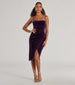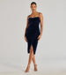 A velvet midi formal dress features a sultry cowl neckline and corset bodice that leads to the flattering bodycon silhouette with a front wrap slit. Perfect for homecoming or banquets.