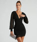 Strike a stunning pose arriving in the Alicia party dress destined to be seen on the dance floor! She features sheer long bishop sleeves. a plunge V-neckline. a sultry low-cut back. a form-hugging silhouette. and a short-length hem. The formal dress is composed of a lined mesh-knit fabric with shimmery rhinestone embellishments. Complete your dressy look with statement earrings and a clutch.