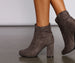 We're all about ankle booties that slay this season. These stylish booties feature an around the ankle fit with ruched detailing. an almond toe. and a sturdy block heel. The ankle booties are composed of a faux suede material. Complete look with a cardigan. high waist skinny jeans. and a cabby hat.