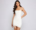 Draw all eyes on you in this pretty mini dress! The dress features a sleeveless square neckline. spaghetti straps. a ruched mini length with drawstring. and an eyelet pattern throughout. The dress is composed of a lined lightweight woven fabric that offers a form hugging fit with minimal stretch. Complete look with block heels and a straw tote.Â