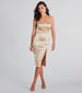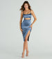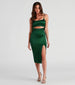 Get ready to have all eyes on you in this attention-grabbing midi dress! Featuring a sleeveless scoop neckline. spaghetti straps. a bold front cutout at the waist. and a bodycon silhouette with a high front slit. this sleek satin midi-length dress will hug your curves. Complete the look with clear heels.