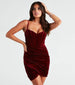 This smooth velvet mini dress brings all the luxe vibes to your look! It features a sleeveless sweetheart neckline. a corset-designed bodice. adjustable spaghetti straps for a customized fit. ruching down the side seams. a wrap-front skirt with an asymmetrical hem. and a short. curve-hugging silhouette. Style with strappy heels for a night out.