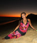 Arrive at sunset happy hour in this bold floral mesh maxi dress. an alluring vibe for your next vacay. Turn heads with the halter cowl neckline. backless design. and curve-hugging silhouette.