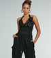 Defy expectations and turn heads in this sleeveless bodysuit at parties or as the sultry bride-to-be! The daring plunge halter V-neckline and intricate floral applique add a touch of polish to a form-hugging silhouette. The ruched detailing accentuates your curves. while the thong bottom with snap-button closures secures the style. Complete the look in a chic midi skirt and strappy mules.