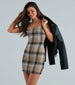 This stylish mini dress features a classic plaid print and a bodycon silhouette in soft knit fabric. Its square neckline. spaghetti straps. and mini-length hem make it perfect for a trendy. dressy look for layering. Style with a chic moto jacket and boots for an evening out!