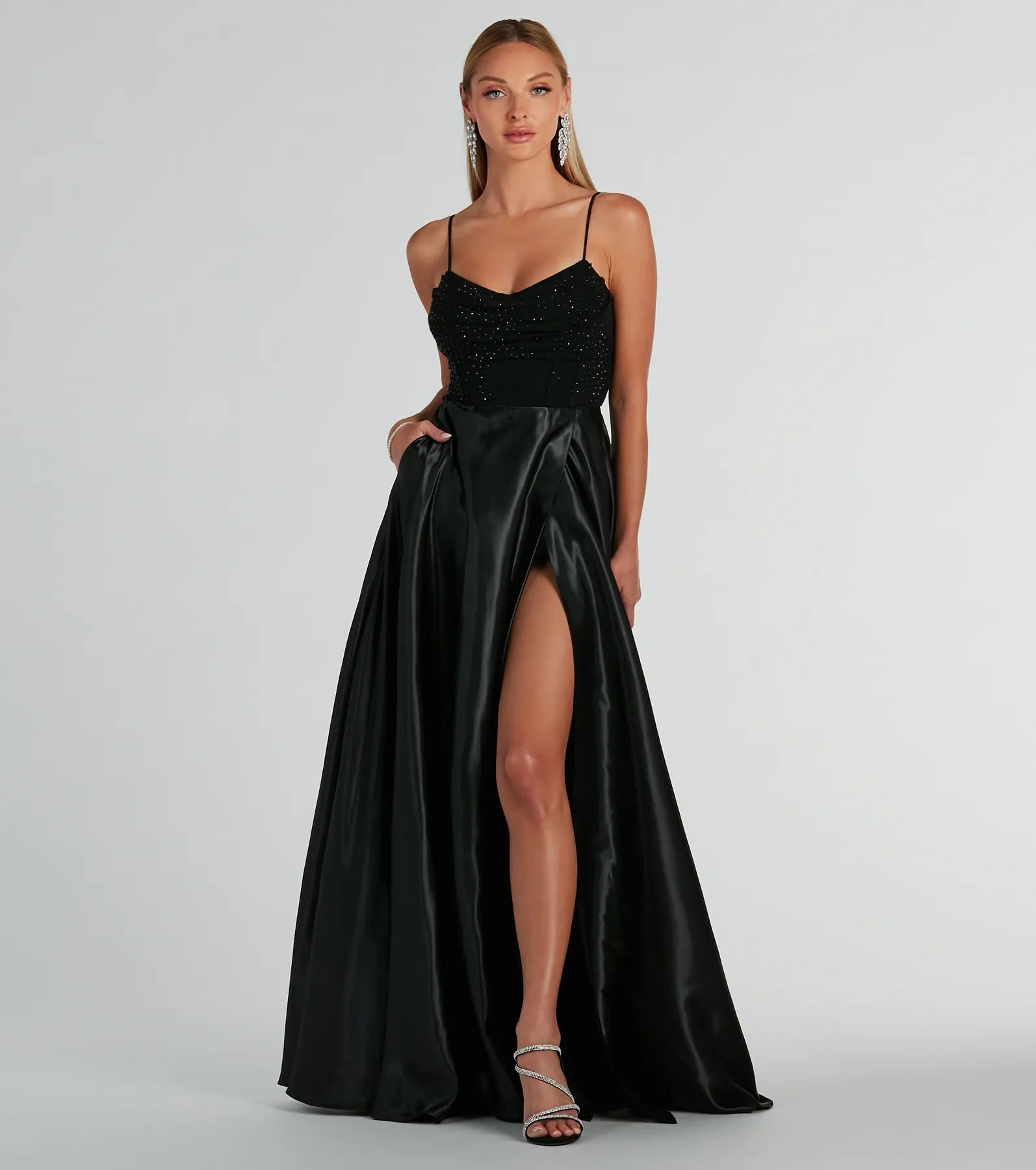 Provoke a captivating aurora in the Ammara floor-length satin formal dress looking stunning at a black tie wedding. red carpet event. or banquet! This exquisite gown features a sultry cowl neckline. adjustable spaghetti straps for a perfect fit. and a dazzling rhinestone-embellished mesh bodice with flexible boning. Hidden side pockets add convenience to the satin A-line silhouette. while a high front wrap slit adds a touch of elegance. Complete the look in rhinestone strappy heels for a sophisticated evening!