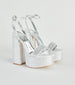 Amp up the glam factor of your fab night-out look with these sparkling platform heels that are sure to turn heads. They feature an open almond toe with a strap. thin adjustable ankle and heel straps. a bold chunky platform sole. an ultra-tall block heel. and all-over mini rhinestone embellishments on the chrome faux leather material. Style with rhinestone fringe earrings for head-to-toe shine.
