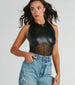 Amp up the chic vibes of your going-out look with this faux leather corset bodysuit. The sultry style features a faux leather top with a sleeveless mock neckline. tank shoulder straps. and an angled ultra-cropped hem. The sheer mesh body continues. creating a snatched corset silhouette with thin faux leather vertical seams. The mesh cheeky bottom has a snap button closure for effortless wear. Pair this form-hugging bodysuit with a mini skirt and lace-up stilettos!