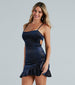 Amplify the shine in this glitter velvet mini dress to shimmer on the dance floor! The mini dress is designed with a square neckline. spaghetti straps. a flattering bodycon silhouette. and a layered ruffle trim along the hem for added drama. Complete the look in strappy heels perfect for birthdays or clubbing!