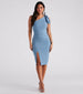 Anabella is the perfect dress for rehearsal dinners and social cocktail parties! She features a sleeveless one-shoulder neckline. a single shoulder strap with bow detail. a form-hugging silhouette. and a midi-length hem with a flirty slit. The formal dress is composed of a lined crepe fabric with a moderate stretch. Style with a sparkly envelope clutch and heels to complete the look!