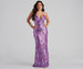 Bring the sparkle and shine with a formal dress that illuminates at your special event. Anisa features a sleeveless V-neckline with padded cups. bungee spaghetti straps that cross at the back. and a bold open back with a sleek bungee bar strap. Her slim-fit bodice features dual cutouts at the waist and an A-line silhouette. The dress is composed of a lined mesh fabric with a damask sequin pattern. Complete your formal outfit with rhinestone heels.