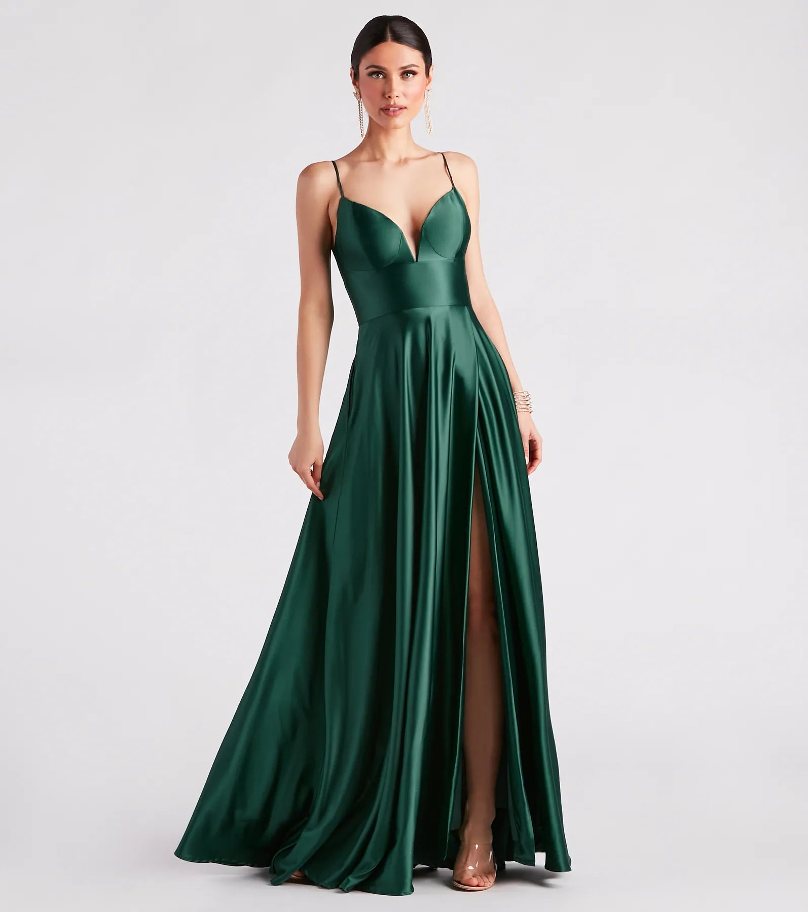 Sophisticated and oh-so-sleek. the Anya satin formal dress will leave them speechless! She features a sleeveless V-neckline with a structured bust. adjustable spaghetti straps for a customized fit. dual high waist seams. a floor-sweeping hem with chic pleating. a wrap-front design creating a high slit. and a flowy A-line silhouette. The luxe satin woven fabric will give off a stunning sheen. Complete the look with rhinestone chandelier earrings for your next gala.