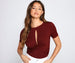This on-trend bodysuit is anything but basic! It features a high crew neckline. short sleeves. front and back keyhole cutouts. a front criss-cross design. and a form-hugging fit. Style this bodysuit with your fave pair of denim and chic mules.
