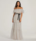 Capture that soft feminine look for your next fancy affair in the Aria ruffled off-the-shoulder polka dot mesh formal dress! Crafted with a sheer mesh fabric with a partial knit lining. she showcases a velvet polka dot pattern for a chic flair. Her off-the-shoulder straight neckline features a flirtatious ruffled overlay. leading to a sheer corset-style bodice with a lined and padded bust and flexible boning to add structure. Her fitted high waist is accented with a velvet belt bow design. flowing down to a whimsical ruffled A-line silhouette with a floor-sweeping hem. Complete the look with stiletto heels.