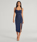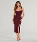 Chic and glam. the Arlette formal midi dress designed with shimmering glitter knit fabric will glitz up your cocktail party. It features a sleeveless sweetheart neckline with a built-in padded bust and a cowl draped overlay. thin tank straps. an open lace-up strappy back design for a customized fit. and a midi-length bodycon silhouette accented with a high front slit.