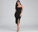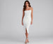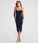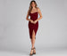 A formal midi dress is the perfect go-to for that upcoming cocktail affair or as a wedding guest. Wow in the captivating Ashlyn dress features a flattering cowl neckline. spaghetti straps that lead to a cross-back design. and a high waist seam. She's designed with a gorgeous wrap bodycon silhouette with a front slit accent and a midi-length hem. The dress is composed of a lined crepe fabric with a moderate stretch. Complete your formal outfit with rhinestone heels and a tennis bracelet.