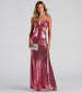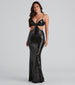 Sparkle and glow with a formal dress that brings the glamour to your special event! Athena features a plunging sleeveless V-neckline with a twist-front accent. padded cups that add extra support. and adjustable spaghetti straps. Her bodice features dual cutouts that lead to a curve-hugging mermaid silhouette. The dress is composed of a lined sequin mesh fabric that offers a form-hugging fit with a slight stretch. Complete your formal outfit with rhinestone heels.Â