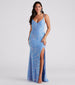 Give off those glam girl vibes in the gorgeous Aubrielle velvet sequin formal dress! She features a sleeveless V-neckline. adjustable spaghetti straps. a floor-sweeping hem with a thigh-high front slit. and an A-line silhouette. The lined velvet fabric showcases all-over sequin embroidery with a stunning iridescent hue sure to catch everyone's eye. Style with rhinestone hoop earrings for your next dance.