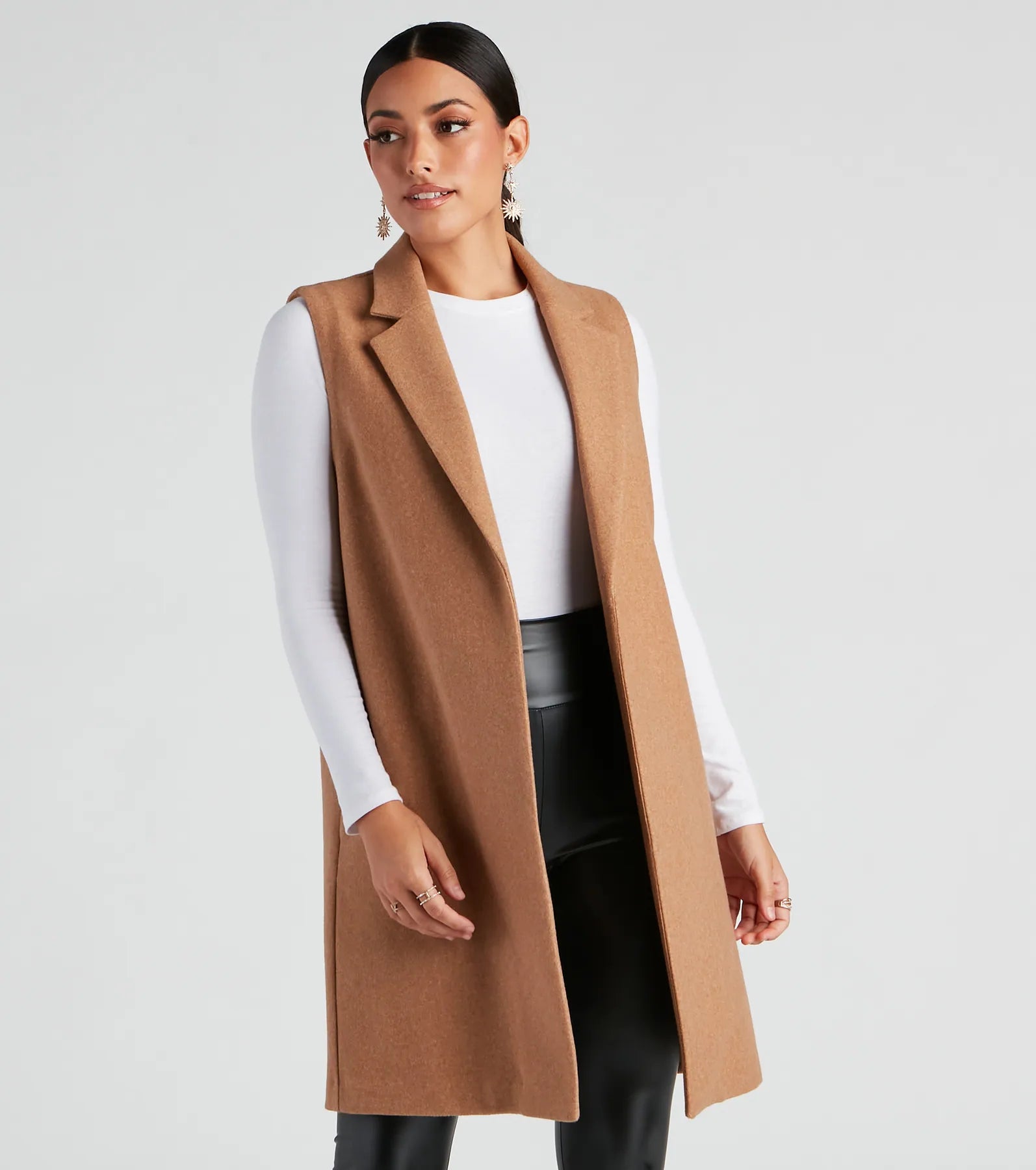 Layer on this faux wool vest for a fashionably-chic look this autumn season. It features a sleeveless bodice. a lapel collar. an open front. hidden side pockets. and a relaxed fit. Style over a basic bodysuit and dress pants paired with ankle booties.