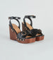 These platform wedges are ready for your weekend away! They feature a square toe. a faux leather strap with studs and a buckle detail. a wooden-like sole. and a wrap-style ankle strap with a buckle closure and stud accents. Complete the look in a wide-leg jumpsuit for a dinner with a view!
