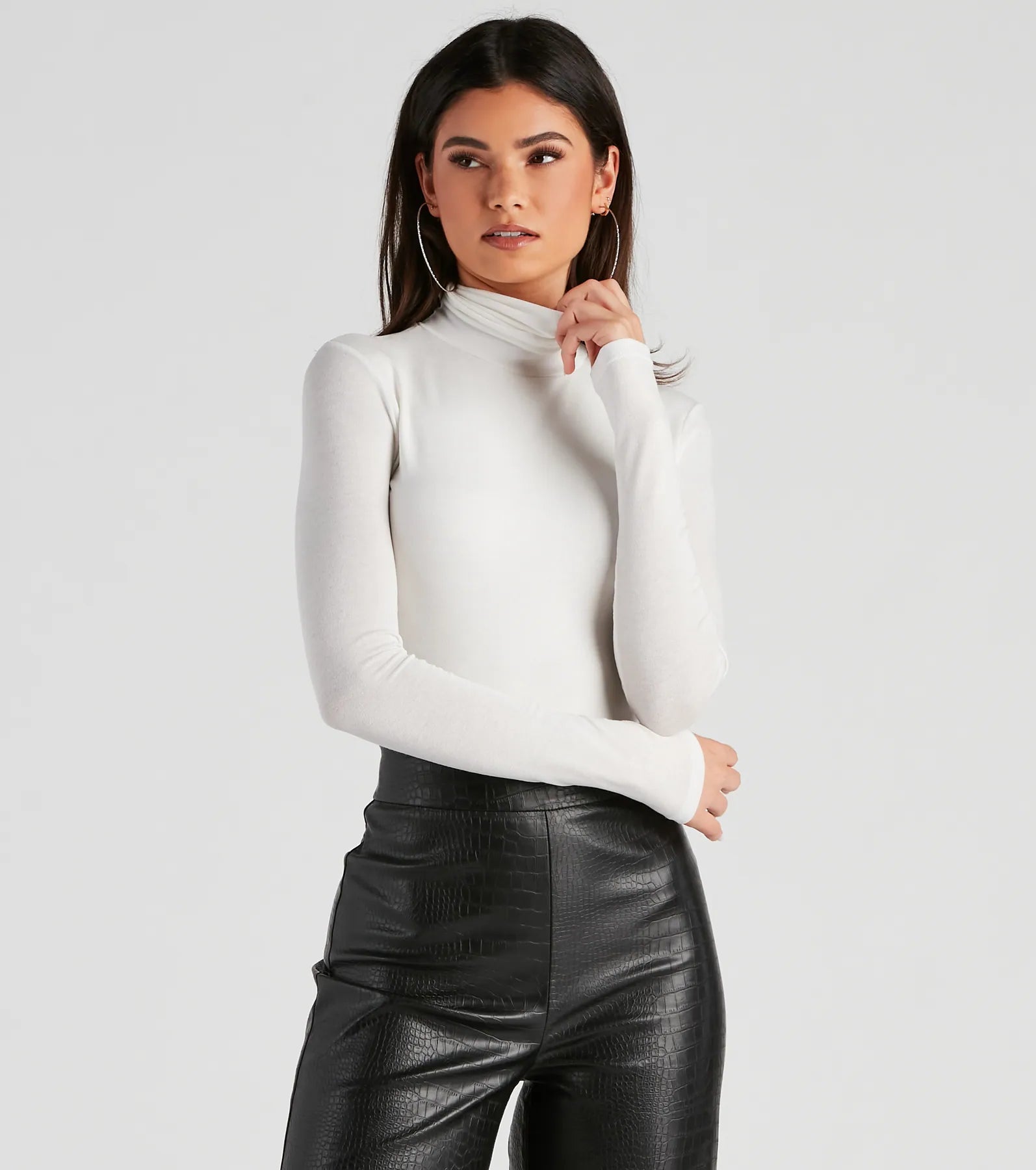 Elevate your outfits effortlessly with our turtleneck bodysuit. perfect for layering your look to perfection. This bodycon long-sleeve top offers both chic style and cozy comfort. thanks to its smooth knit fabric. Crafted from double-lined crepe knit material. it provides a sculpted fit that accentuates your curves. The bodysuit silhouette ensures a polished. tucked-in appearance. making it ideal for workwear ensembles or any layered outfit.