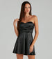 Show up ready to swoon every heart in this satin skater dress at parties! It features a strapless sweetheart neckline with non-slip grip lining. a pleated bust overlay. an eye-catching strappy lace-up back. and a short-length hem. Complete the look with a rhinestone choker and earrings!