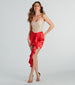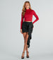 Pour up beauty in this satin mini skirt to make your spicy entrance! It features a sleek high-rise waist with cascading front ruffle trim. a flattering bodycon silhouette. and a mini-length hem on silky satin woven fabric. Complete the look in a crop top and heels for dinner and dancing!