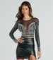 You always know how to arrive best dressed. and this statement crop top is happy to help! With a glamorous allure. this mesh crop top stuns featuring sheer fitted rhinestone embellished long sleeves with faux pearl trim cuffs. a crew neckline. front faux pearl and rhinestone embellishments. and a sheer back. Complete the look in a sleek midi skirt for a holiday soiree!