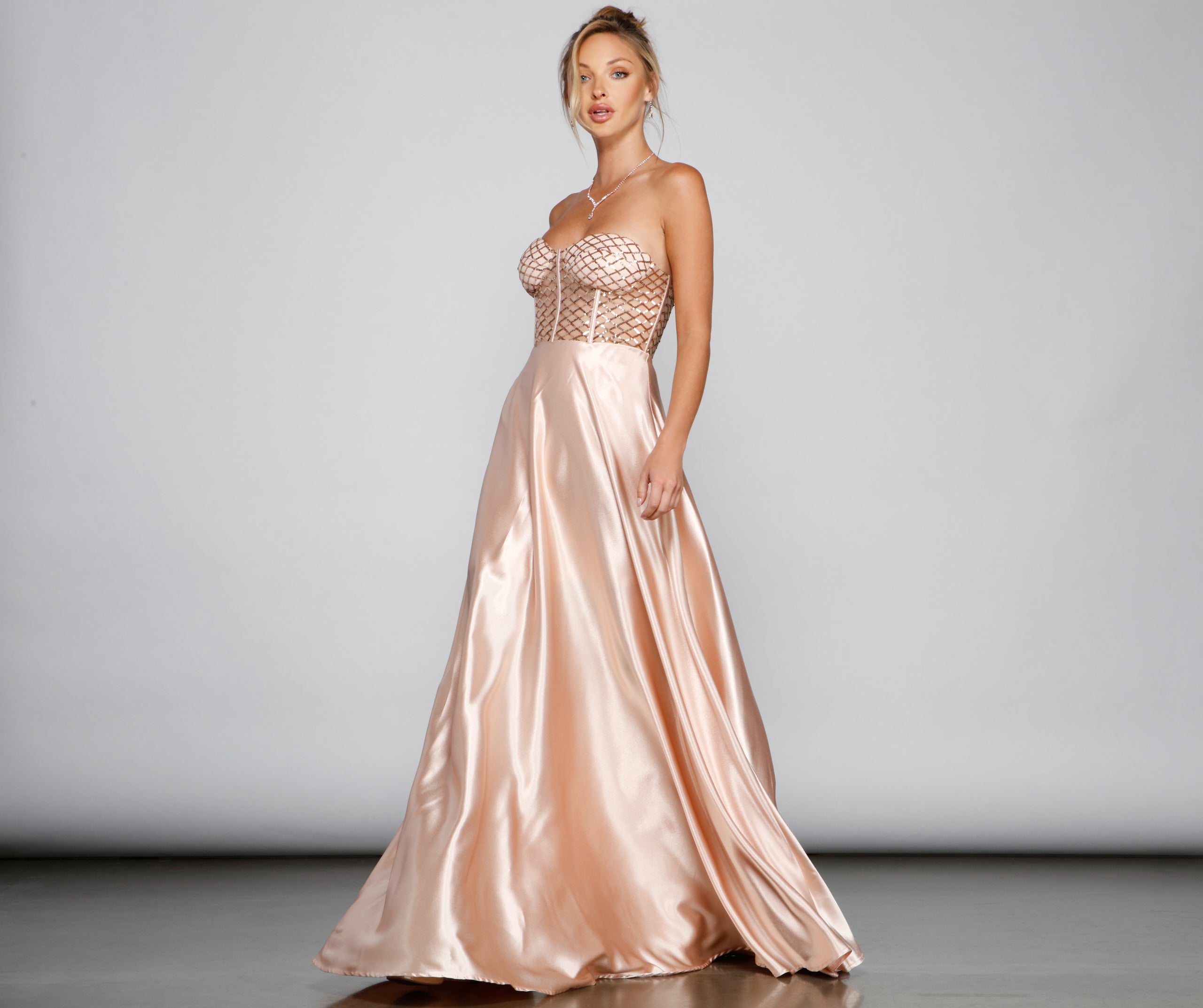 Elegance is an understatement when it comes to the Betsy sweetheart corset a-line formal dress. Her sleeveless bodice shapes a delicate sweetheart corset-style bodice designed in a sheer sequin mesh with flexible boning to give her structure. and a built-in padded bust with a non-slip grip. Her fitted empire waistline sweeps into the luxe satin floor-length a-line silhouette that flatters every figure. Complete your look with a rhinestone choker.