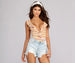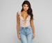 Get hyped on stripes in this perfectly flirty. multi-color ribbed bodysuit. Pair it with cutoffs and you're good to go! Suit features a ruffle-trim. deep V neckline with ladder cutout detail. a thong-style bottom. and snap-button closure. Suit is made from a soft. woven material with just a hint of stretch.