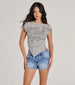 Edge up your going-out look with this vintage-inspired graphic crop top! Made with cotton-blend fabric. the tee showcases a trendy "Bikers Club" screen perfect for concerts or bar-hopping. It features a wide boat neckline that can be styled off-the-shoulder. short cap sleeves. ruching down the side seams. an asymmetric V-shaped front hem. and a cropped. form-hugging fit. Pair with a denim mini skirt.