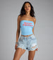 The perfect graphic tube top for summer parties! This trendy style features a strapless neckline. ruching. a fitted mid-length hem. and a script that reads. "Bikinis & Bellinis."