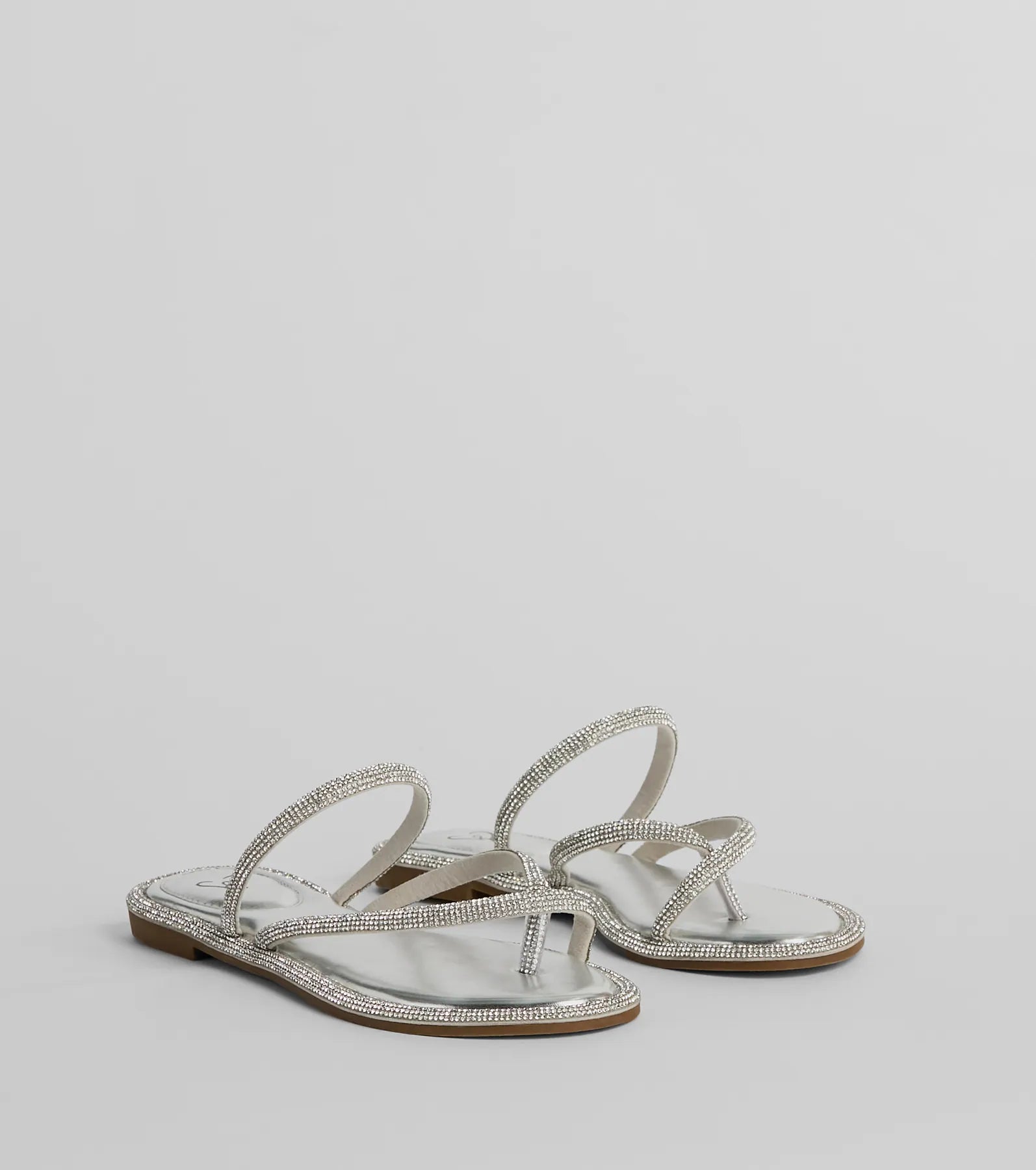 Sizzle and sparkle this season in these rhinestone flat sandals perfect for any occasion! With a round toe and dazzling rhinestone embellishments. these strappy sandals are sure to turn heads while the metallic flat footbed adds extra shimmer. Complete the look with a cute sundress.