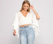 Go boho chic in a crop top that brings the good vibes. The crop top features a surplice neckline. kimono-style ruffled sleeves. and a cropped hem. Complete your look with high waist skinny jeans and mules.