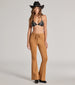 Channel that boho babe energy in these lace-up flare pants perfect for summer festivals! Designed with a smooth faux suede fabric. they feature a high-rise waist. a hip-hugging fit. a form-hugging fit through the legs. and a flared leg hem for that trendy vibe. Complete your look with a tube top. hoop earrings. and strappy sandals.