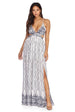 Get those boho vibes going in this summer ready maxi dress! It features an ivory hue. a sleeveless bodice. a plunging V neckline. sexy waist cut outs and narrow adjustable straps that lead to an open back design. The back features a smocked elastic band and a tie back accent. The waist leads to a sweeping maxi length silhouette accented with a high side slit. The navy blue bohemian design is perfectly complemented with the ivory background. Dress is composed of lightweight woven fabric that offers a relaxed fit with minimal stretch.