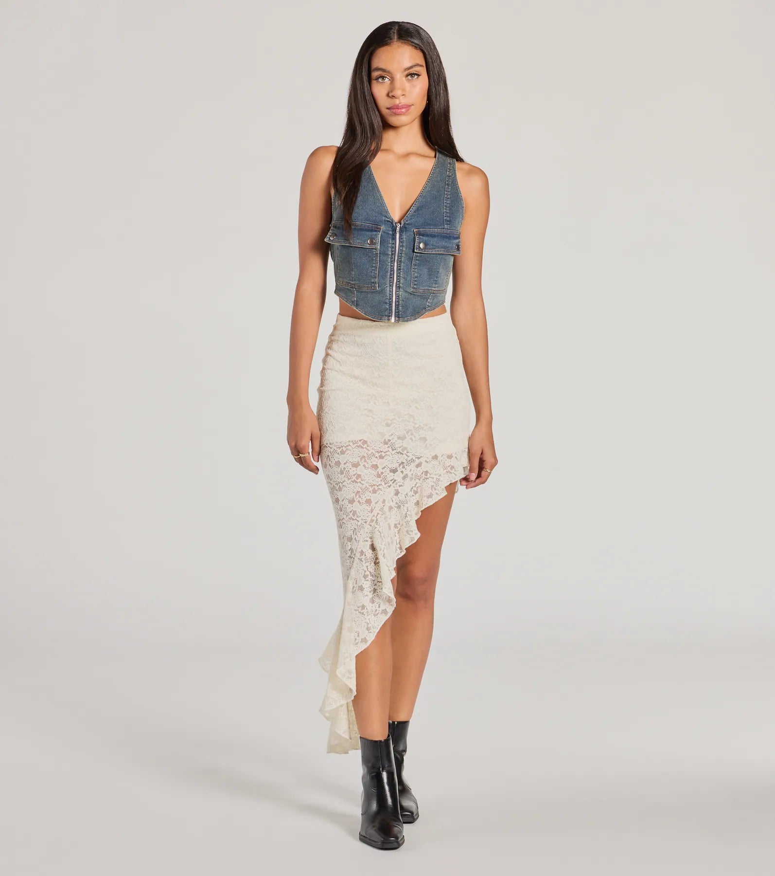 Bring the bohemian western allure to your summer 'fits with this breezy ruffled lace midi skirt! Designed with sheer floral lace fabric. it includes a built-in knit shorts lining for coverage. The skirt features a high-rise elasticized waist for added stretch. an asymmetric midi-length hem creating a high-cut side slit accented with a ruffled trim. and a form-hugging silhouette. Style with a crop top and sandals.