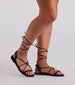Let festival season inspire your spring wardrobe with these on-trend sandals that bring a boho flair. They feature an open almond-shaped toe with a toe strap. a thin. asymmetric. strappy design across the foot. a thicker heel strap. a matching thin strappy design that wraps around the leg. and a flat sole. Style with a flowy midi dress and statement earrings.