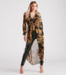 Show off your bold babe status with this eye-catching and chic chiffon duster. It features a V-neckline. a smocked high waist with a partial button-down front. long sleeves with cinched smocked hems. and a flowy high-low silhouette with a ruffled front design. The airy chiffon fabric features a chain-link and scroll multi-print pattern. Layer over a bodysuit with faux leather pants and heels.