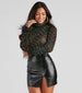 Level up your chic status with this bold sheer mesh bodysuit! It features a mock neckline. long fitted sleeves with fab marabou feather hems. faux pearl and rhinestone embellishments. a thong bottom. and dual snap-button closures. Complete your gorgeous party look with a mini skirt and strappy stilettos.